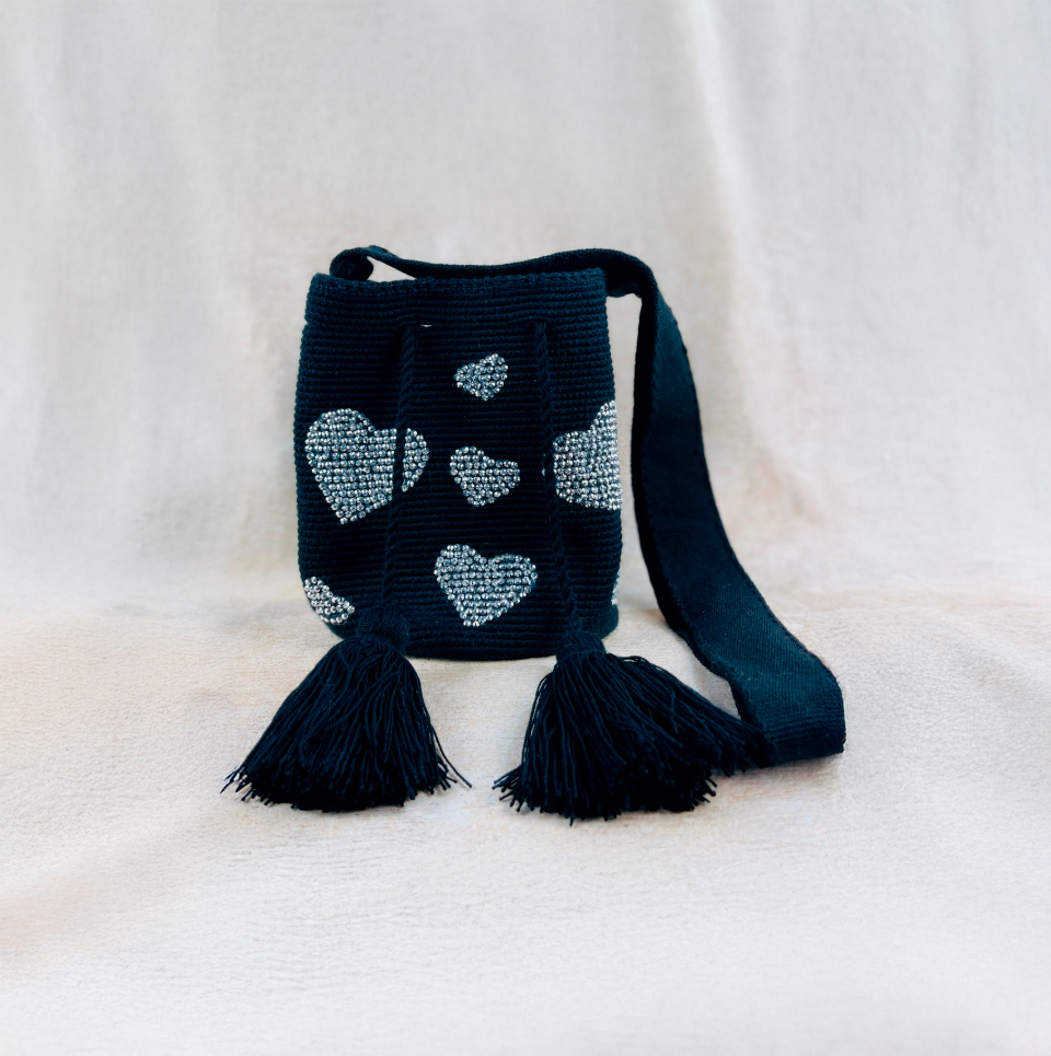 Mochila artesanal tejida a mano, con diseño de corazones en cristales sobre fondo negro. Elegancia artesanal con un toque moderno y sofisticado.